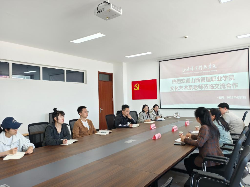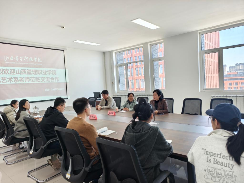 2025年4月3日上午,为深入贯彻落实国家关于深化产教融合、服务地方经济发展的战略部署,加强高校间的协同创新与合作交流,山西管理职业学院文化艺术系党委书记孔丽琴、副主任岳俊萍、教师王翰基一行人莅临我院,与艺术与设计学院负责人李因杰及部分教师进行了深入的交流研讨。