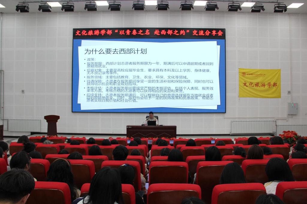 为了促进西部地区的经济发展和社会进步,进一步宣传服务基层优秀西部计划志愿者先进典型,弘扬“奉献、友爱、互助、进步”的志愿精神,引领更多的青年加入西部计划志愿者队伍,全力服务乡村振兴战略,同时为大学生提供锻炼自我、服务社会的机会。文化旅游学部于2024年3月21日在化学报告厅举行“以青春之 赴西部之约”交流分享会。此次分享会由武国锋老师主持,2019级学长霍英杰主讲,2020级全体在校生参会。