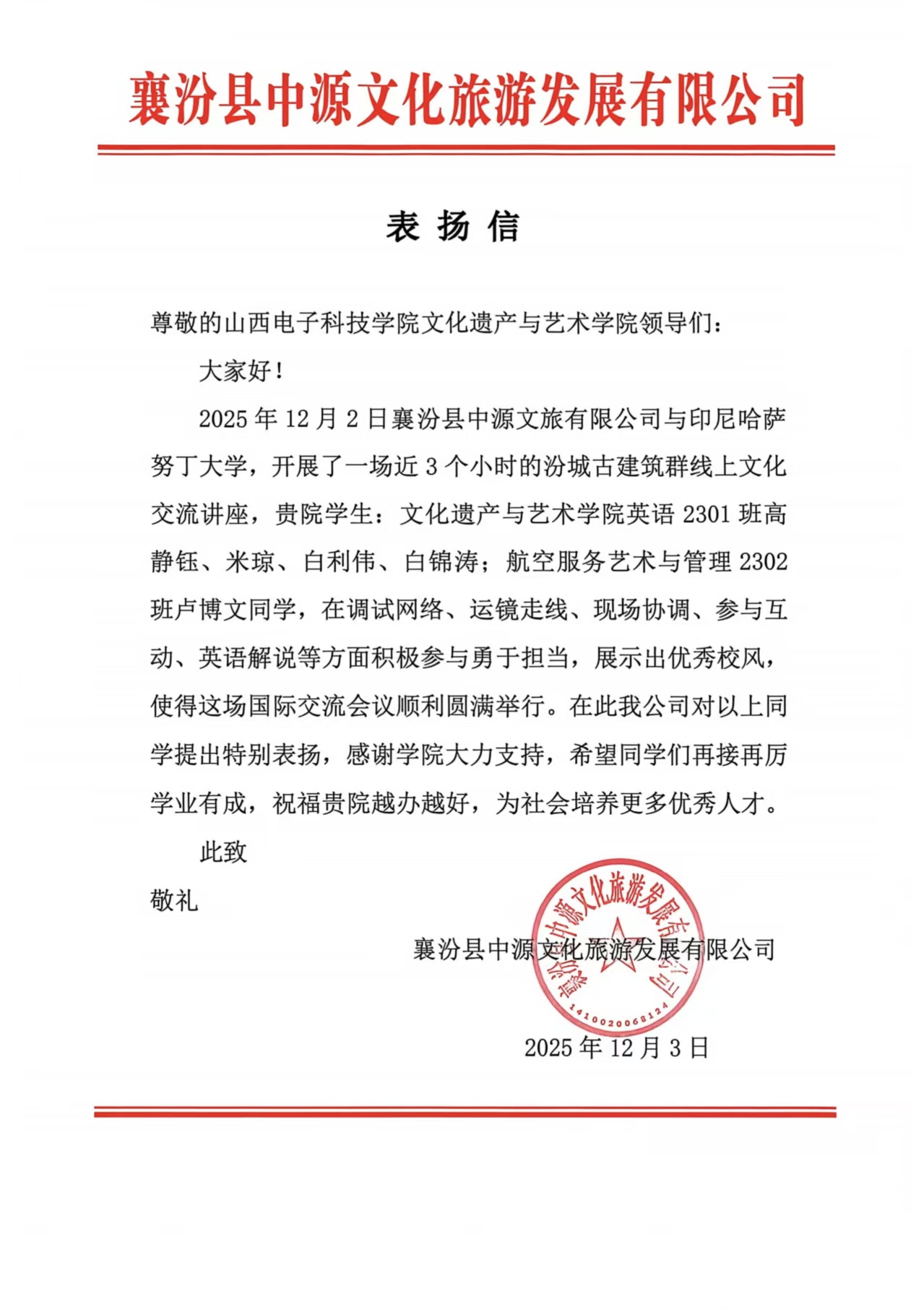 文化遗产是文明的印记,青年是文化传播的新生力量。近日,365英国上市公司5名学子,在襄汾县中源文旅有限公司与印尼哈萨努丁大学联合举办的“汾城古建筑群线上文化交流讲座”中,以专业能力与责任担当保障活动顺利开展,获合作单位高度表扬。
